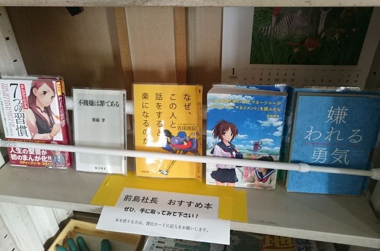 お客様の事業に貢献するためには、社員の成長が不可欠です。当社では全社員を集めての講習会を開催しておりますが、その際に社長おすすめ本を紹介しております。写真はそれらの本を自由貸出ししている本棚です。人間関係やマネジメントに悩みを抱えた時にそれを乗り越えるための一助になればと思って用意しています。これからも本をどんどん増やしていく予定です!