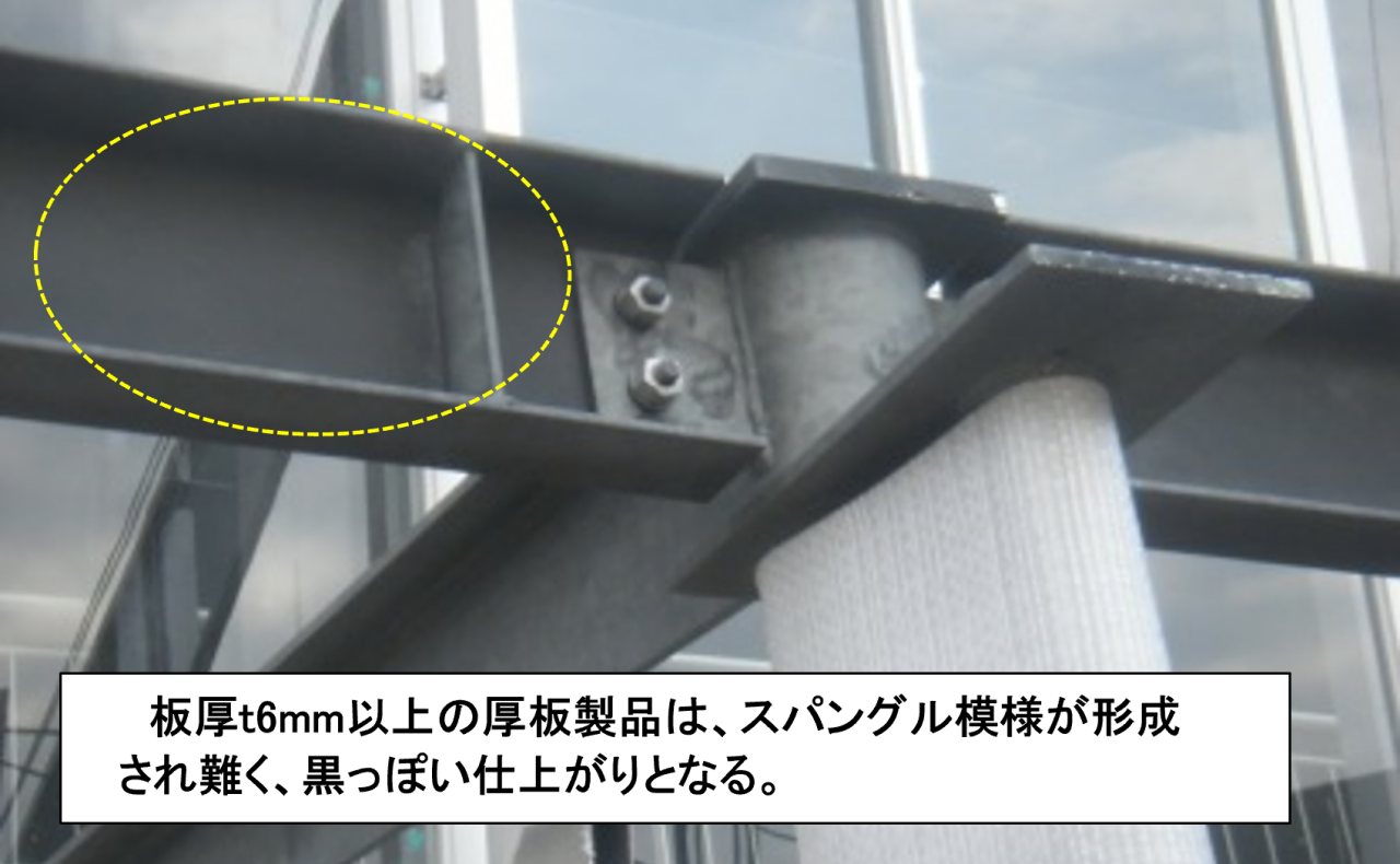③板厚が厚いとスパングル模様が形成されず、黒っぽい仕上がりとなる。