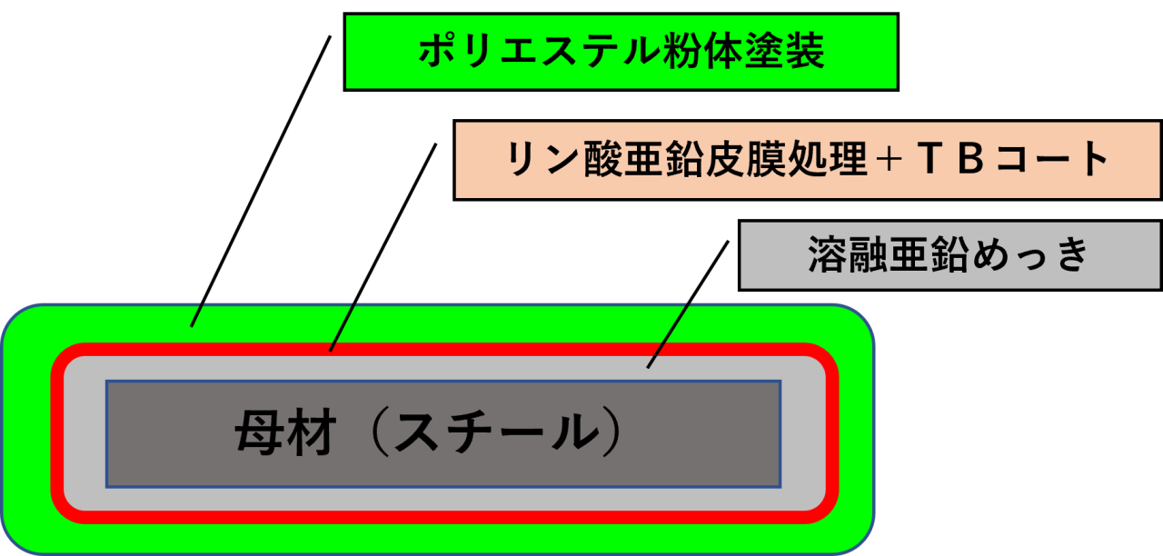 亜鉛めっき製品をリン酸亜鉛皮膜処理した後に、特殊防錆処理(TBコート)を行う事で塩害地でも塗膜の長期付着と母材からの錆びを防ぎ、メンテナンスコストを抑える。