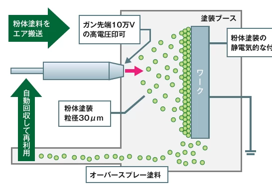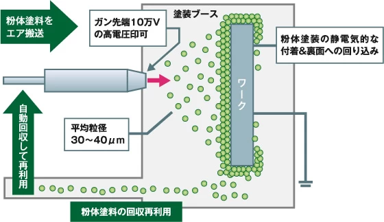 塗料は専用のガンから吐出されるときに、10 万ボルトの高電圧が印加され、帯電し金属ワークに静電気的に付着します。 その後200℃20分間焼付け、塗料を溶融・硬化させます。(下図参照)