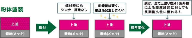 膜厚 | 2液溶剤型ポリウレタン塗装と同等以上の耐久性 ※粉体塗装は上塗りのみで60~120μm以上の膜厚を容易に確保 | ポリウレタン塗装における上塗膜厚は25μm程度 ※下塗+中塗トータルで60~80μmを確保 | 【図3参照】 |